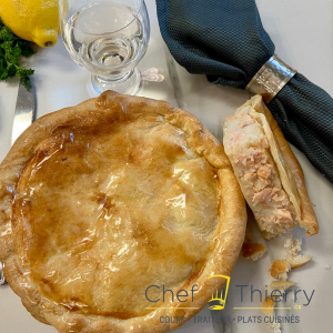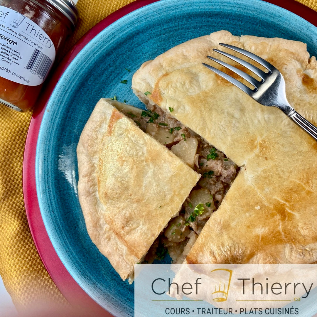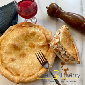 Plats cuisinés, prêt-à-manger, traiteur de Chef Thierry à Gatineau! Produit congelé. Nous avons deux formats : pour 6 à 8 portions. Coupé en 4 morceaux ou pâté entier Ingrédients : Farine, poulet, oignon, carotte, céleri, bouillon de légumes (eau, oignon, carotte, céleri, persil), beurre, crème, épices, sel. Contient blé ou triticale, lait.