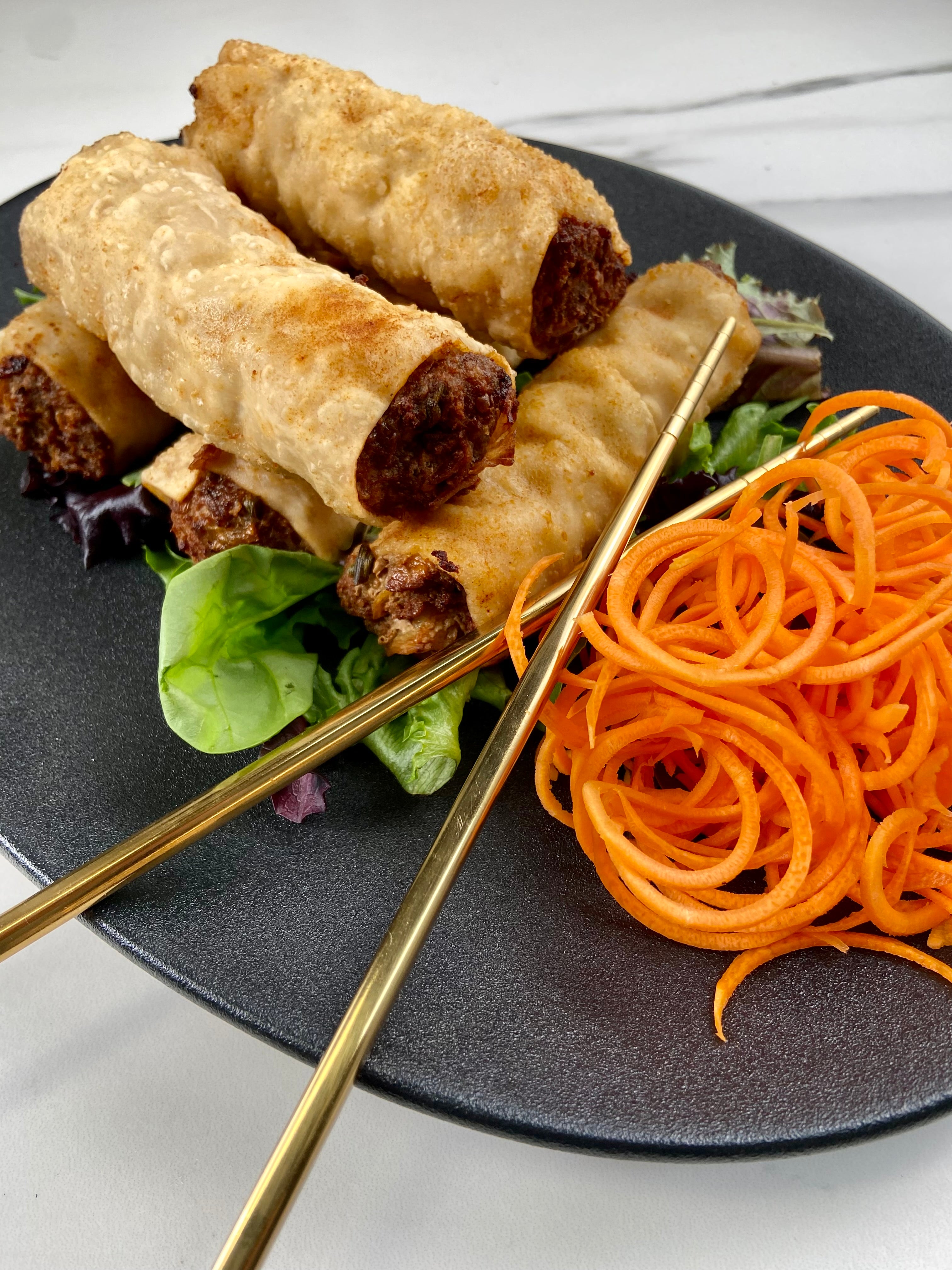 5 unités par paquet. Possibilité d’ajouter de la sauce pour les eggs rolls : Sauce pour egg roll – Chef Thierry Ingrédients egg roll : Pâte à egg roll (contient farine, oeufs, fécule de maïs), porc haché, blanc d’oeufs, épices, poudre d’ail, gingembre, farine de riz, oignons, oignons verts, choux, sauce hoisin (contient soya, blé, maïs, sésame). Contient blé ou triticale, oeufs, maïs, soya, sésame.