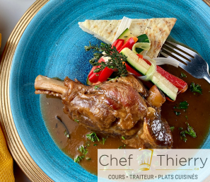 Jarret d’agneau, sauce au porto, pommes de terre et légumes du moment