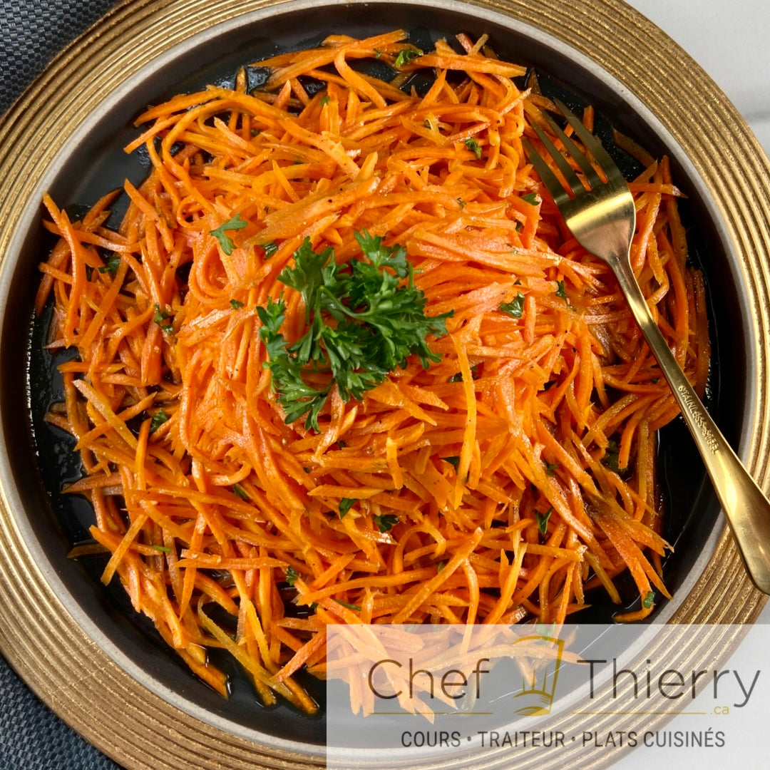 Pour 2 portions. Bon pour 3 jours. Ingrédients : Carottes, huile canola, moutarde de Dijon, sirop d’érable, persil, sel, poivre, cumin, vinaigre balsamique.  Contient sulfites, graines de moutarde. 500g