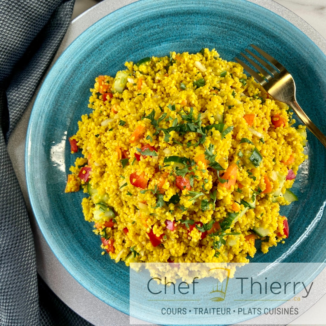 Pour 2 portions. Bon pour 3 jours. Ingrédients : Semoule de couscous (blé), tomates, poivrons, persil, raisins secs (sulfites), huile d’olive, jus de citron, sel, poivre.  Contient blé ou triticale, sulfites. 500g