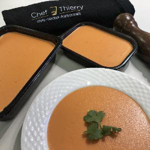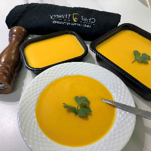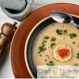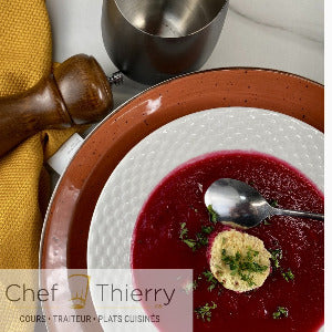 Plats cuisinés, prêt-à -manger, traiteur de Chef Thierry à Gatineau! Produit congelé. Disponible en deux formats : 1 portion : 400g, 3 à 4 portions : 1kg. Ingrédients : Bouillon de légumes (eau, carotte, oignon, céleri, persil), betteraves, oignon, pommes de terre, pomme, crème, sel et épices.  Contient lait.
