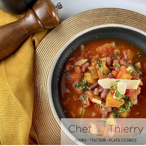 Fait de légumes frais, taillés à la main. Disponible en portion individuel et familial. Ingrédients : Céleris, carottes, oignons, courgettes, haricots verts, ail, tomates en boîtes (tomates, feuilles de basilic fraîche, sel, chlorure de calcium, acide citrique naturelle), fond blanc de veau (eau, os de veau, carottes, oignons, céleris, persil), flèche de porc, basilic, huile d’olive, sel, poivre.